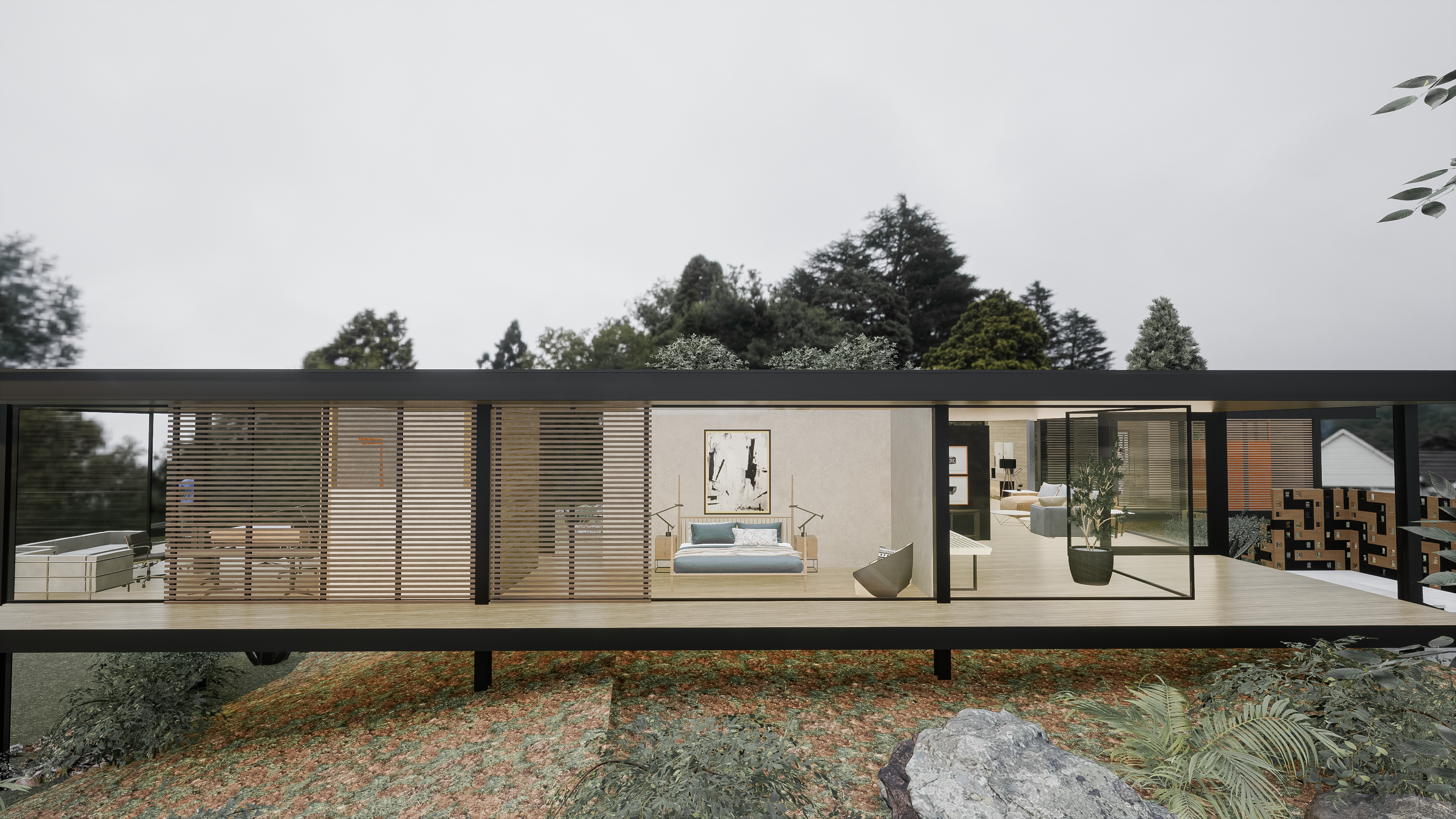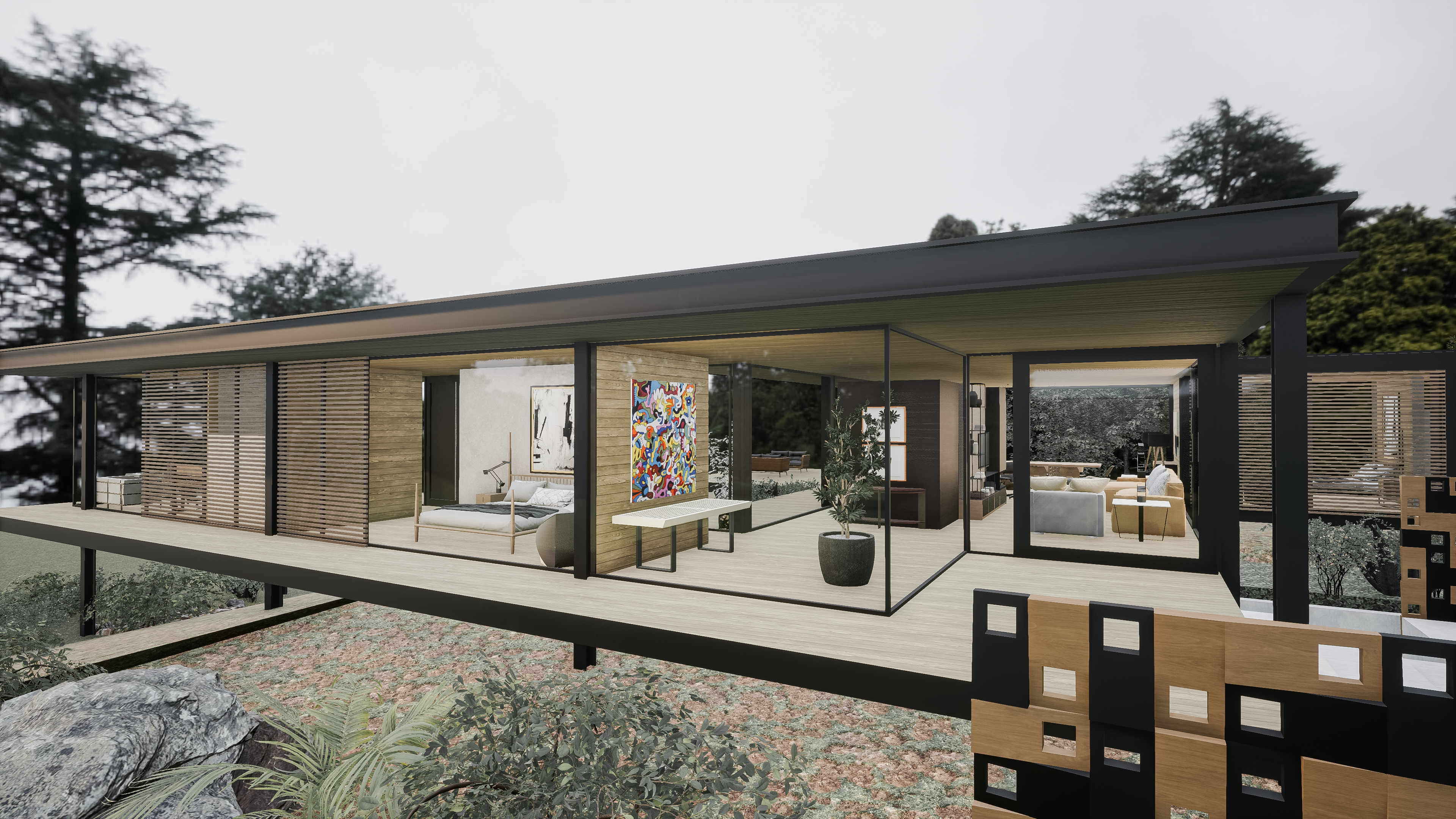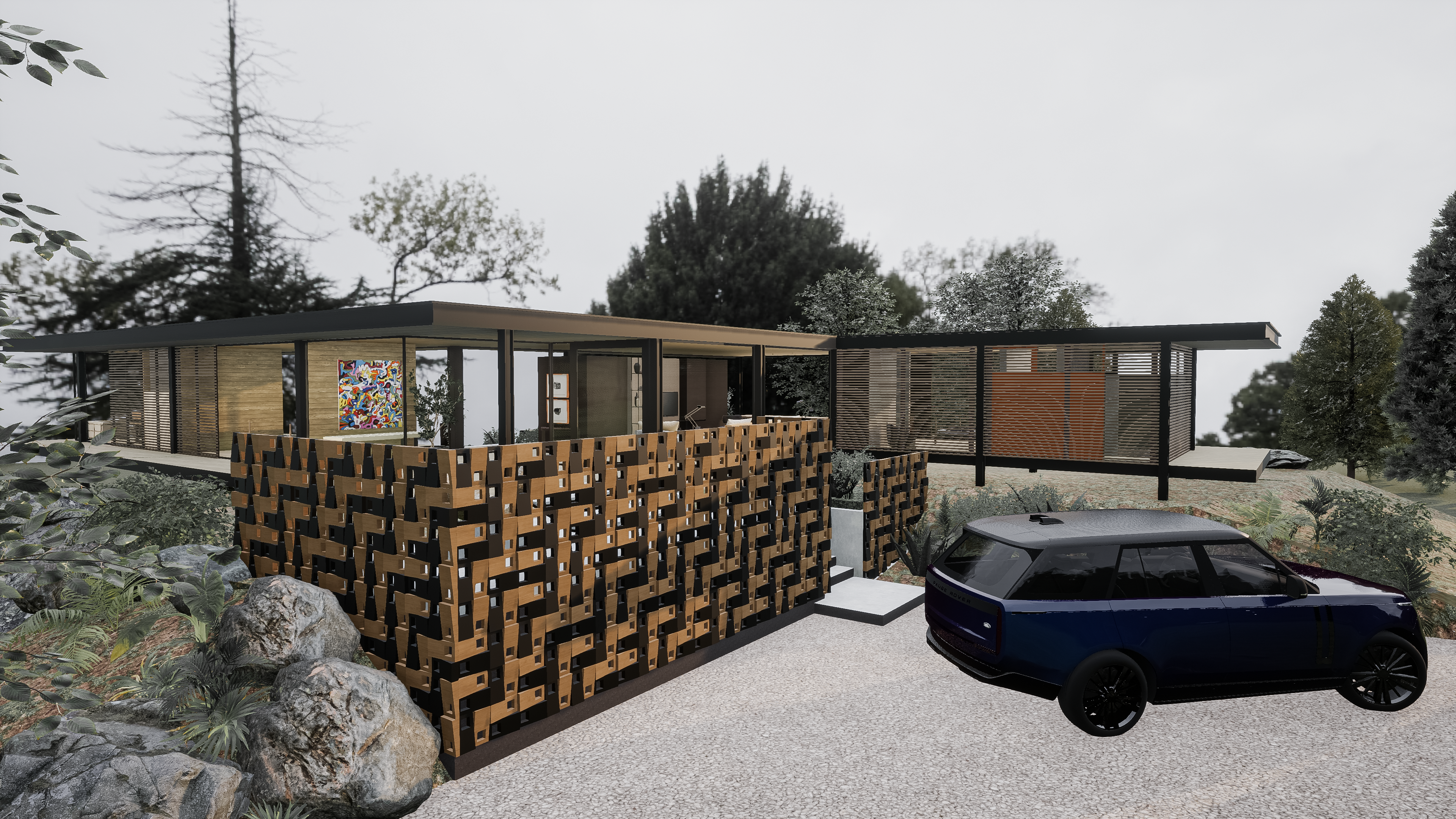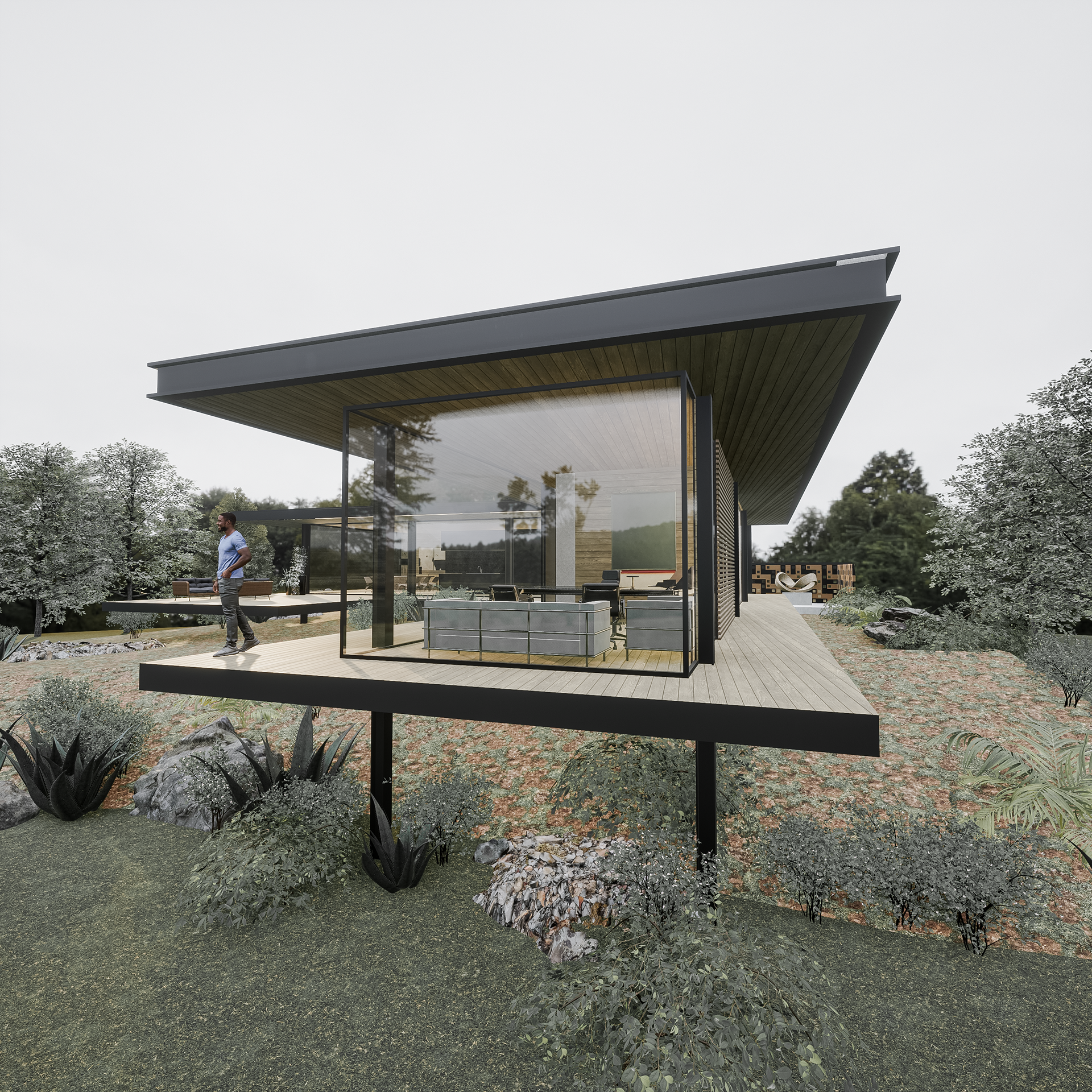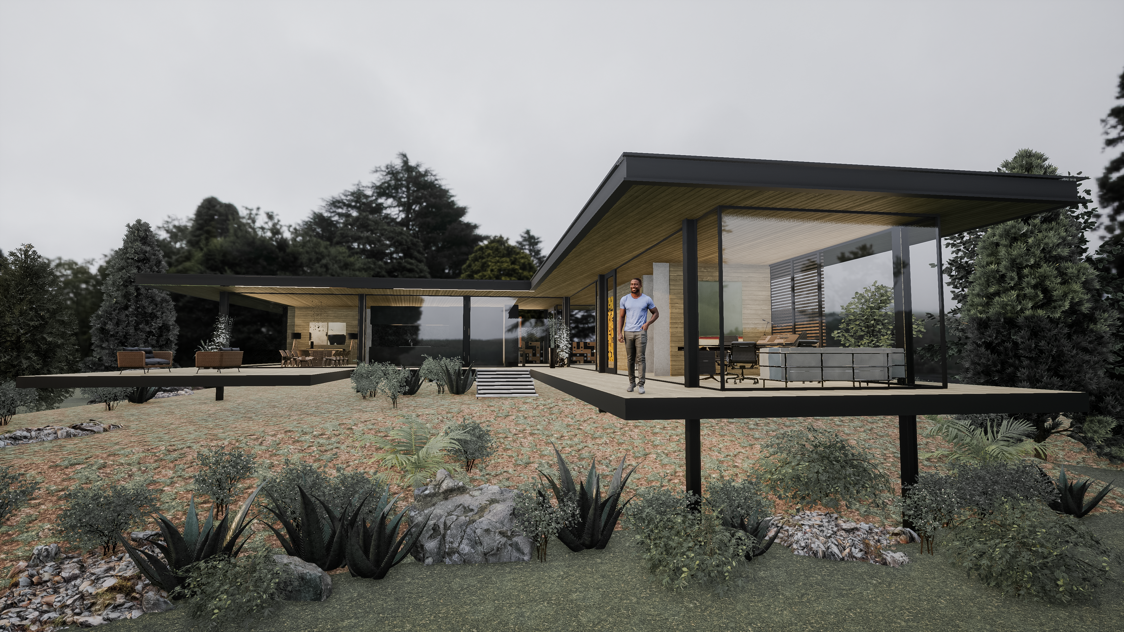 While the villa emphasises horizontal planes and luxury, the chalet focuses on verticality and simplicity. Together, they cater to different personalities—one who thrives in modernity and another who seeks a rustic connection to nature.