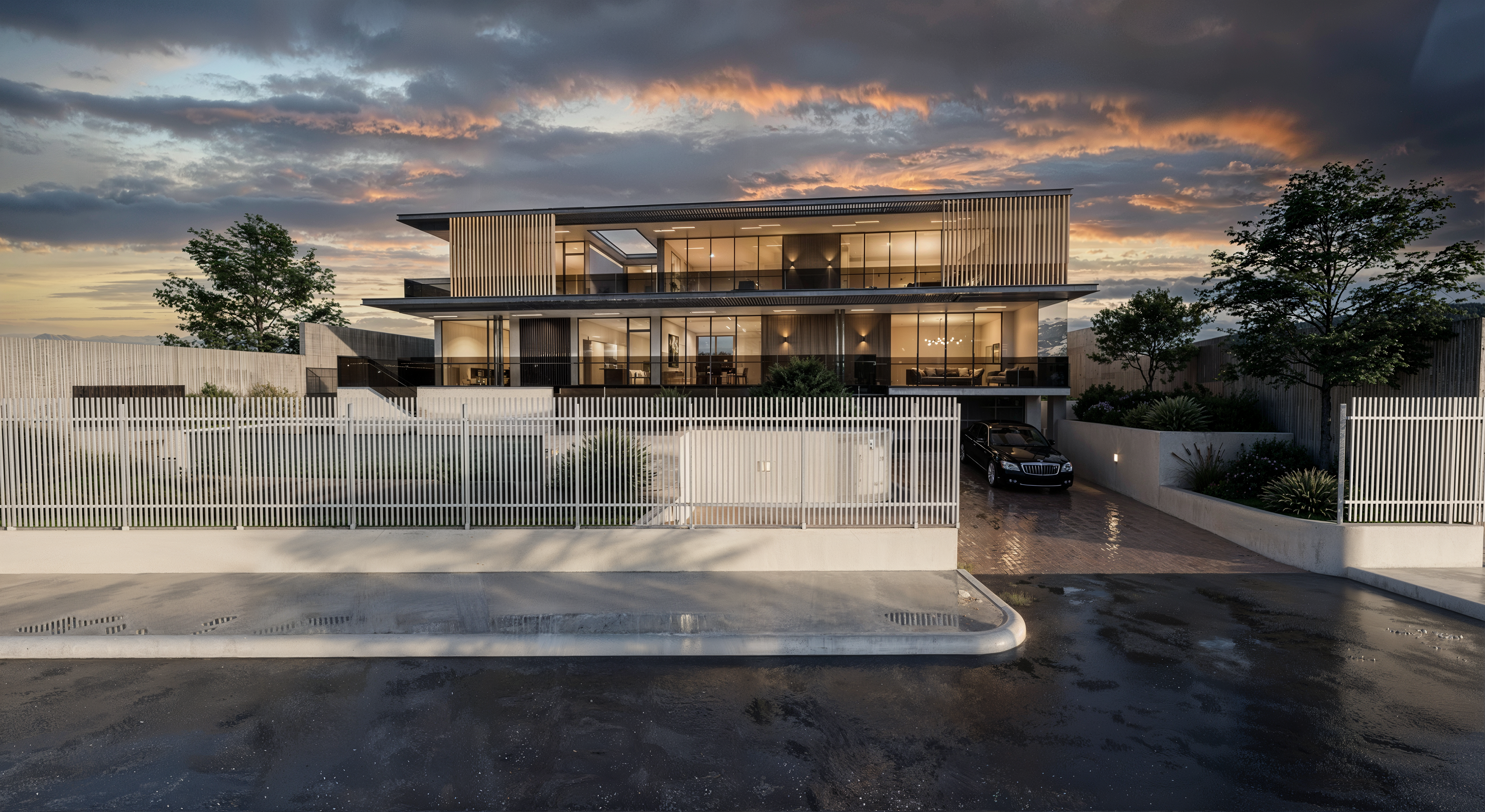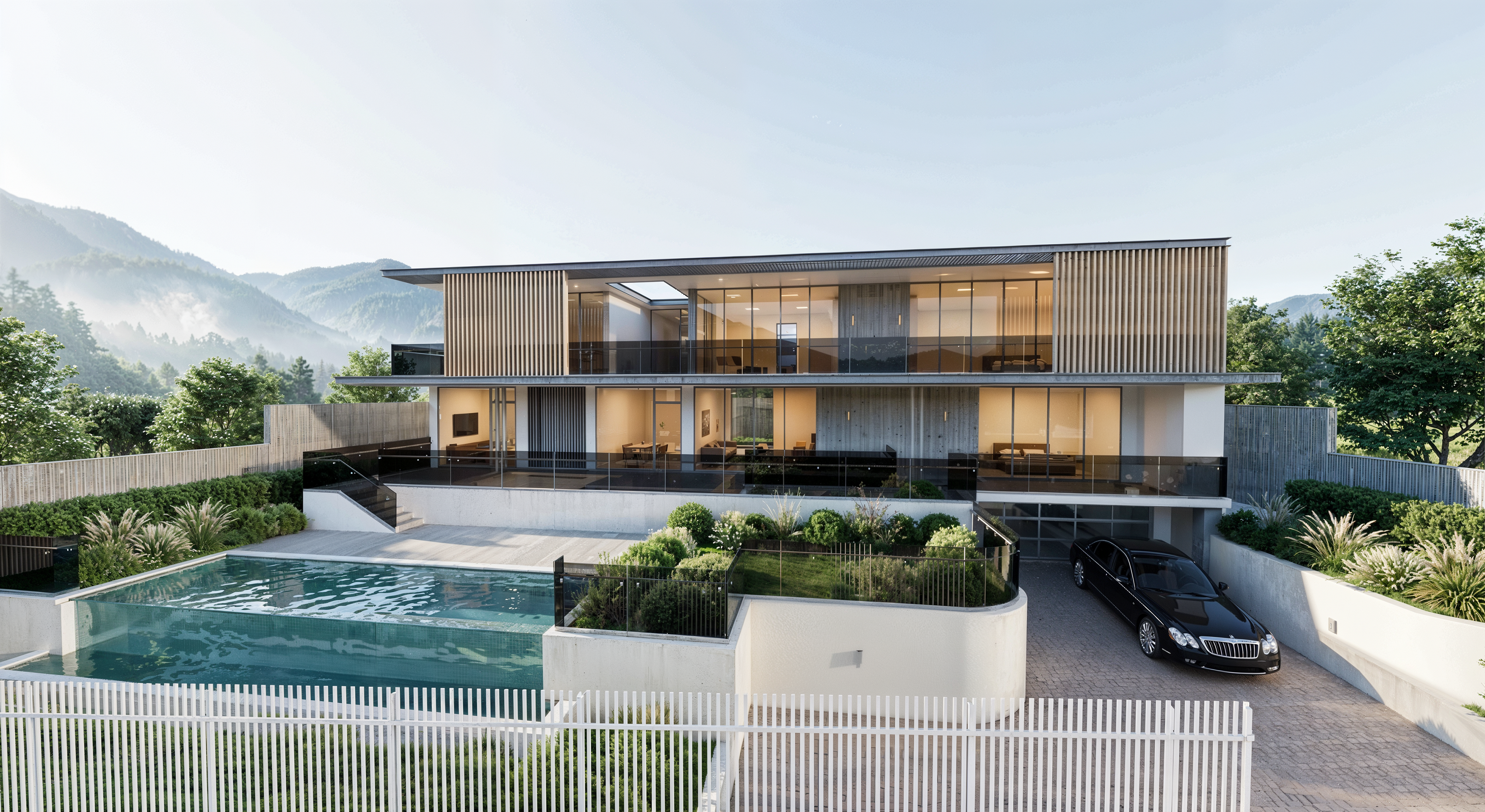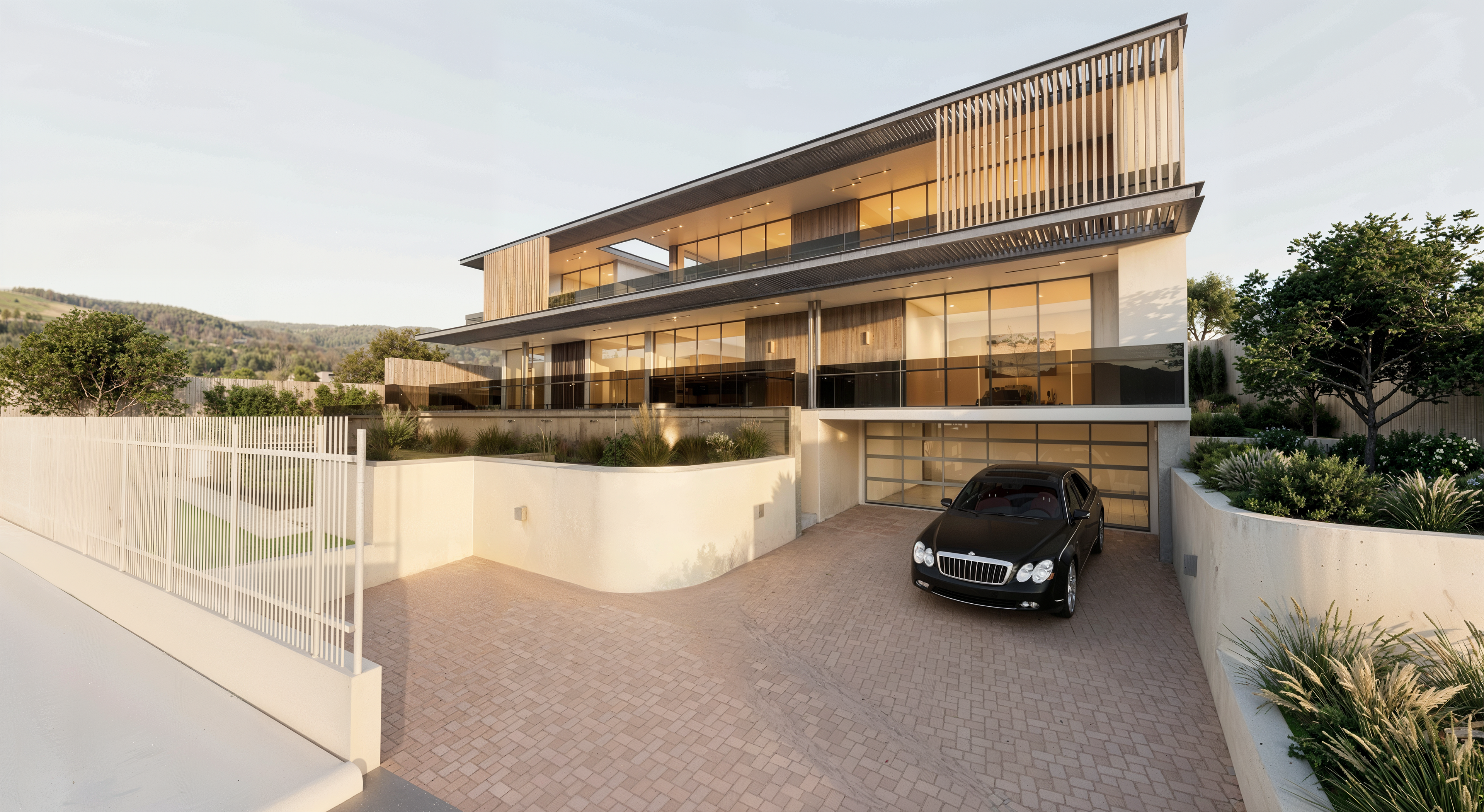 “4 bedroom ,3 and half bathrooms , study , gym double lock up garage ,terraced open entertainment spaces ,private Family residence on a steep terrain site .This residence explores the interplay of transparency, with front facing street views and floor to ceiling openings and balanced proportions. Defined by horizontal lines, natural stone, and timber accents, the design creates a refined modern aesthetic that integrates architecture, landscape, and lifestyle into one continuous experience.” "The goal of design is to raise the expectation of what design can be." – Paula Scher