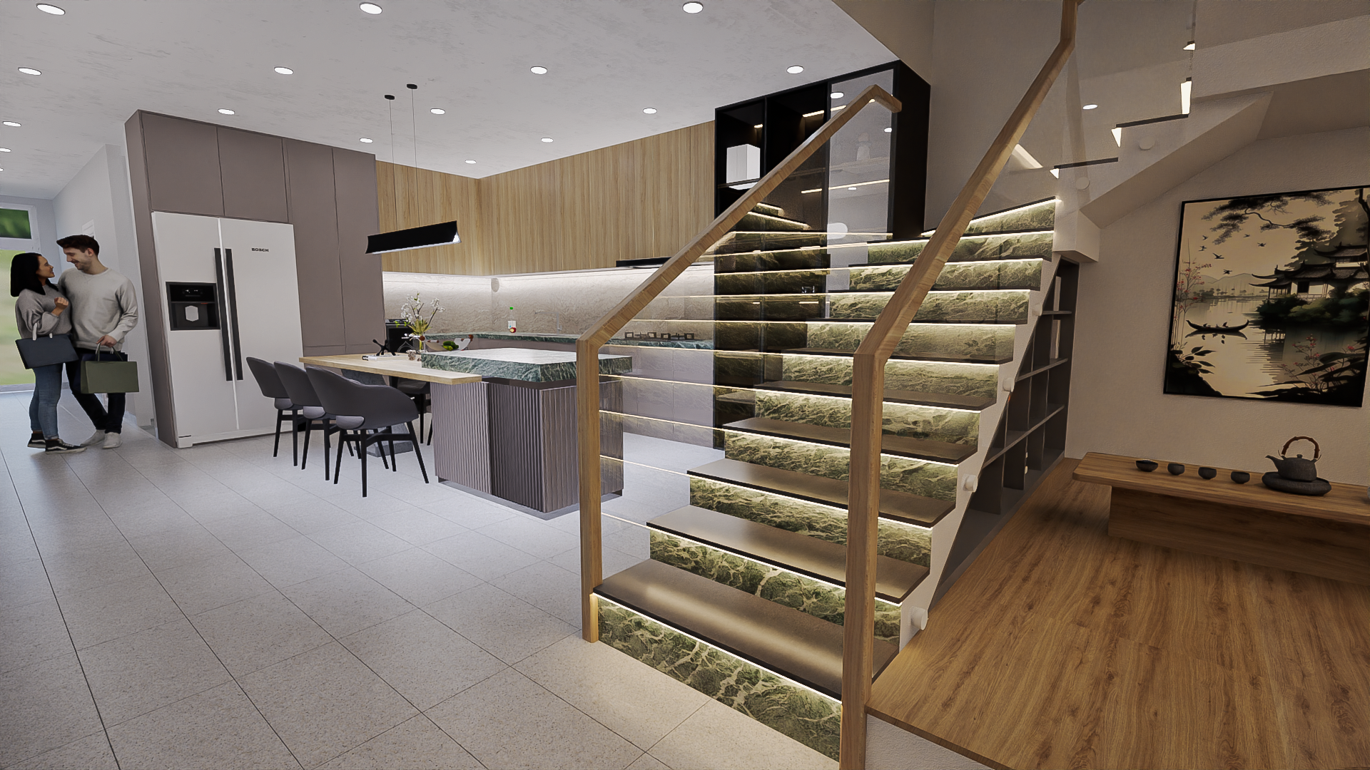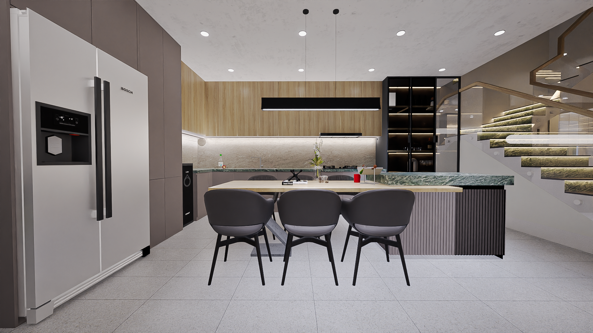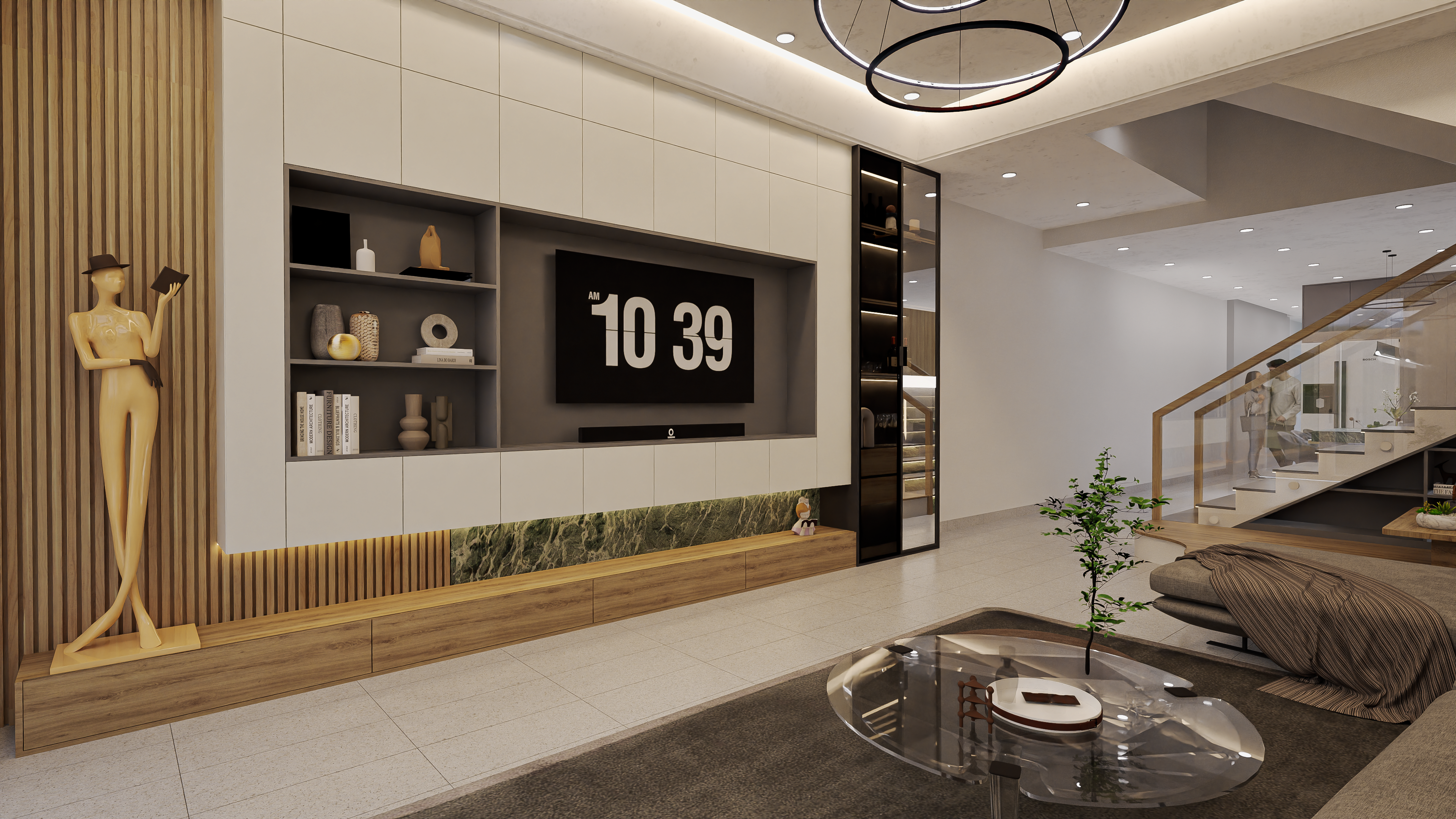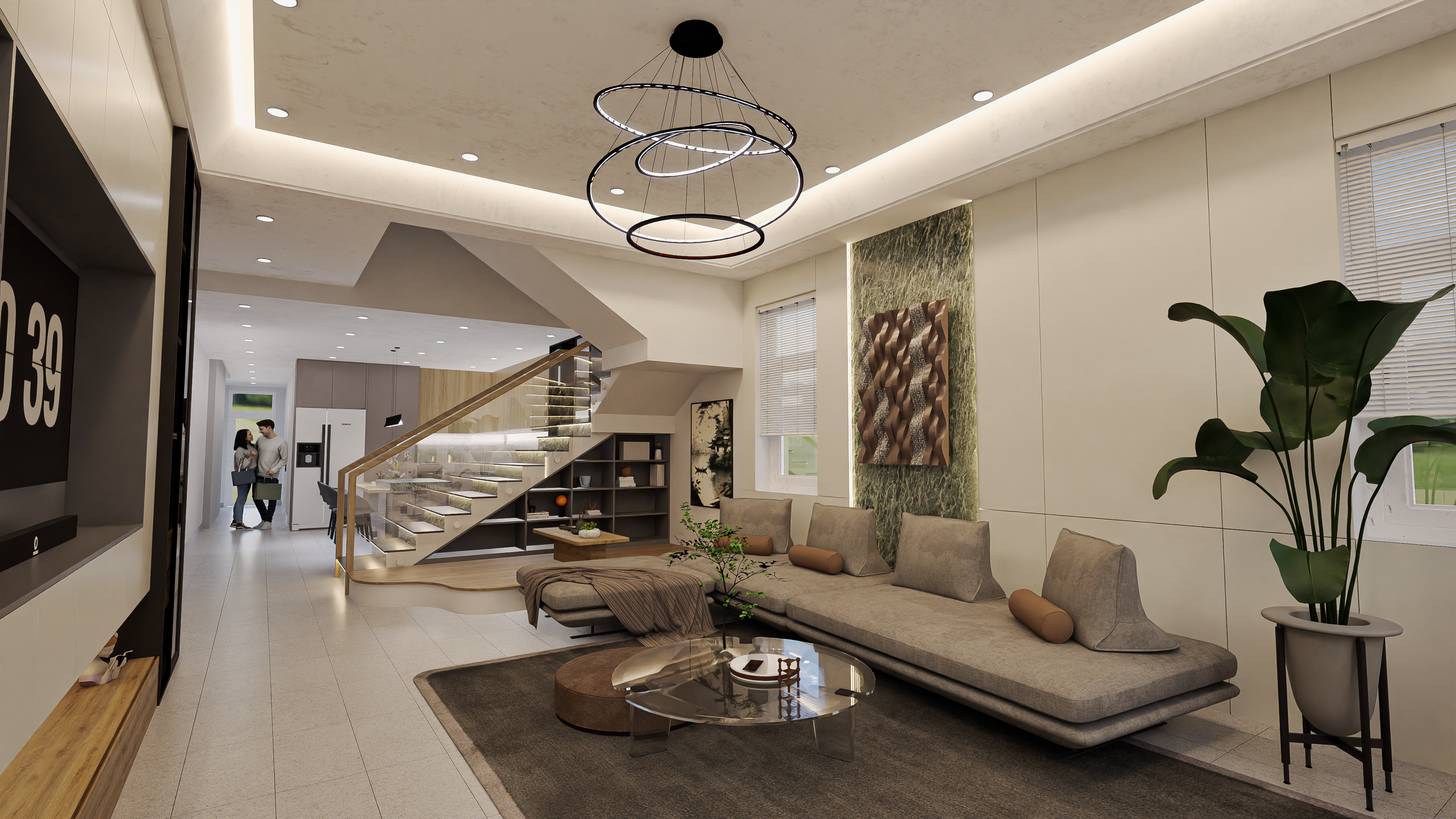 This living space reflects a contemporary modern architectural style with a focus on clean lines, open flow, and elegant simplicity: Minimalist ceiling design with recessed lighting and sleek circular pendant lights creates a stylish, modern ambiance. Neutral color palette with beige, gray, and earthy tones establishes a calm, sophisticated atmosphere. The floating staircase with glass railings adds a striking architectural feature, enhancing openness and transparency. Modern furniture with low, streamlined seating and a glass coffee table emphasizes comfort while keeping the space uncluttered. Natural touches, including indoor plants and textured wall art, bring warmth and a biophilic element into the design. The open-plan layout enhances connectivity between spaces, giving a sense of spaciousness and flow. Overall, the design combines modern minimalism with cozy sophistication, creating a refined yet welcoming home environment.