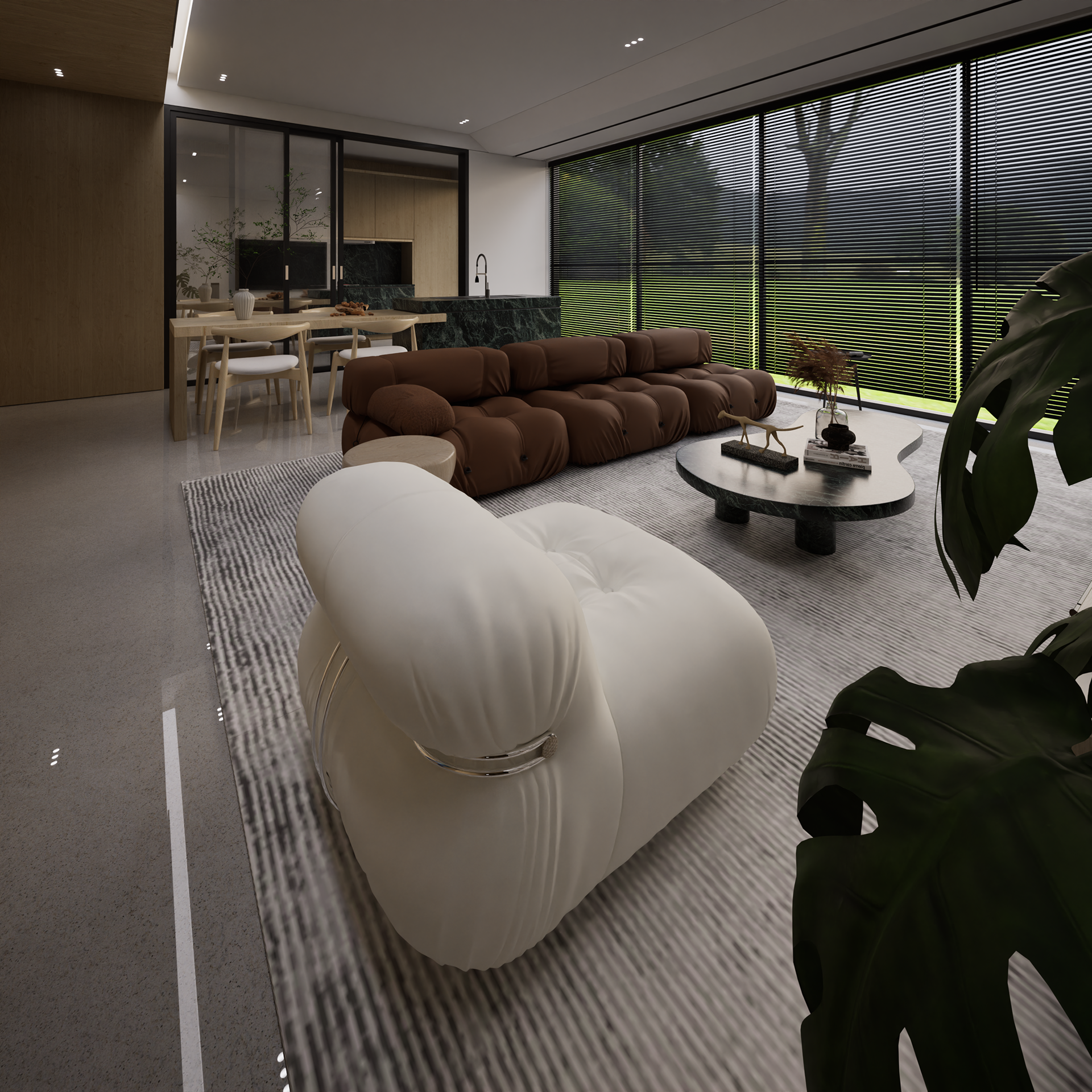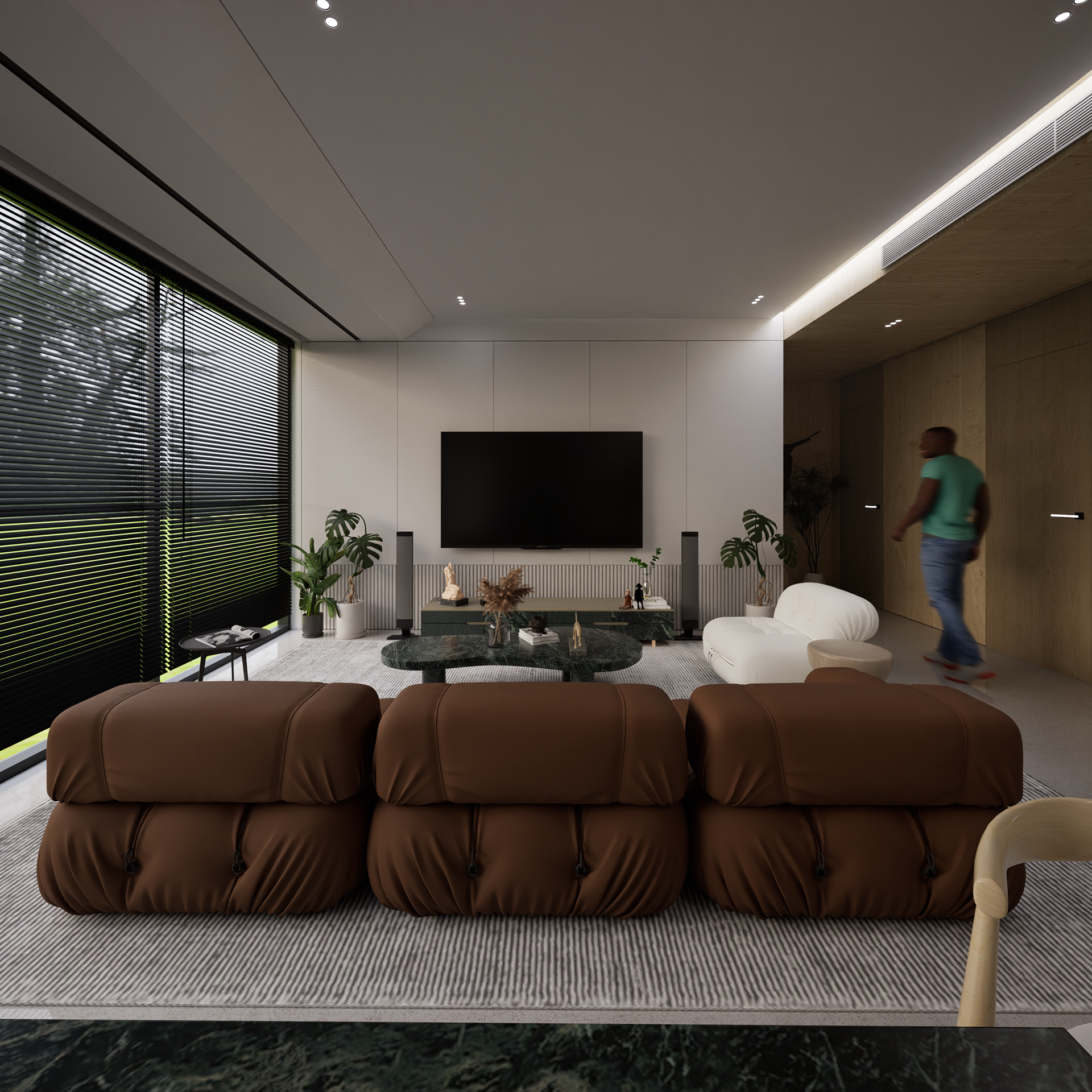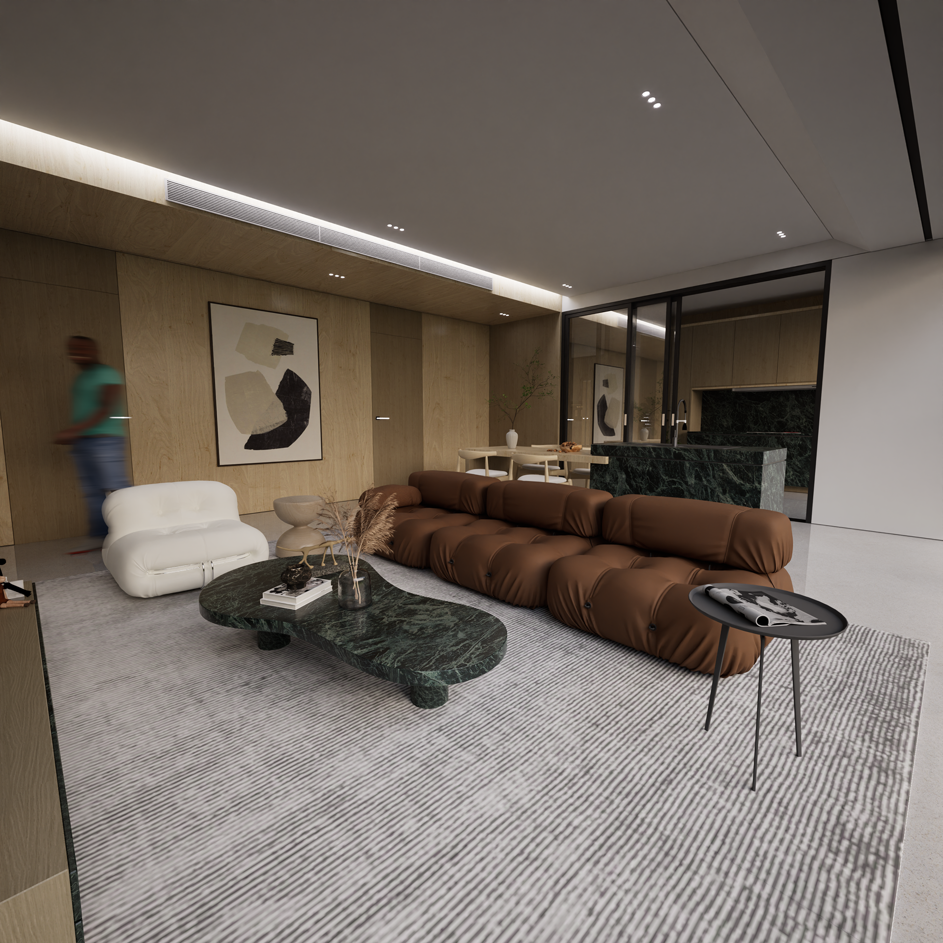 This project is a contemporary residential interior located in Manicaland, Zimbabwe, conceived as a calm, modern sanctuary that responds to the region’s climate, lifestyle, and evolving taste for refined living. Design Intent The core idea was to create a space that feels grounded, warm, and timeless, balancing modern minimalism with natural textures. Inspired by Manicaland’s lush landscapes and cooler climate, the palette leans into earthy tones, timber finishes, stone textures, and soft natural light—elements that quietly echo the surrounding environment. The open-plan living, dining, and kitchen arrangement encourages flow, family connection, and visual continuity, while maintaining clear spatial zoning through furniture placement, lighting, and material transitions.