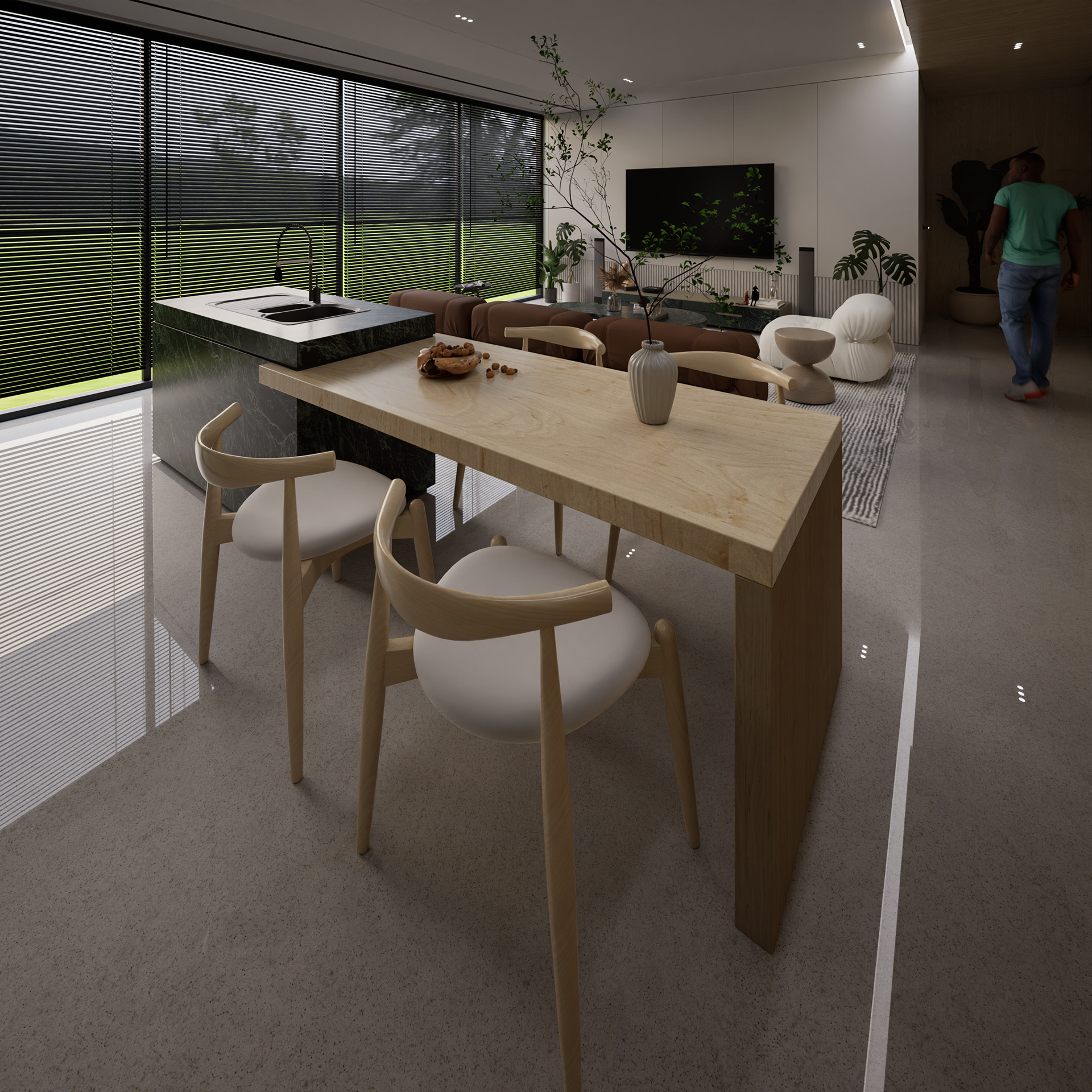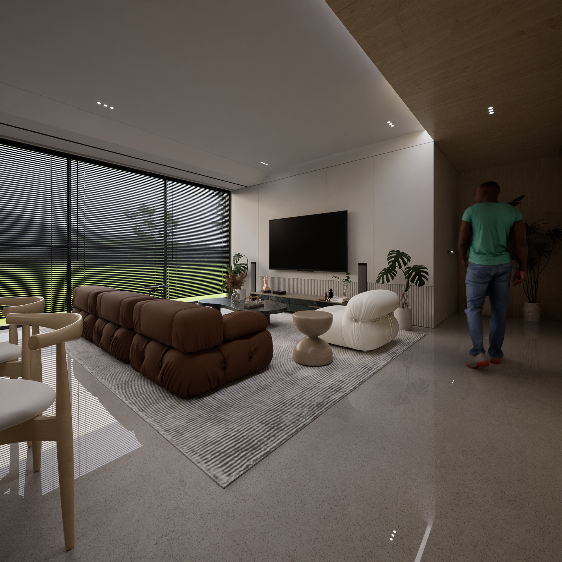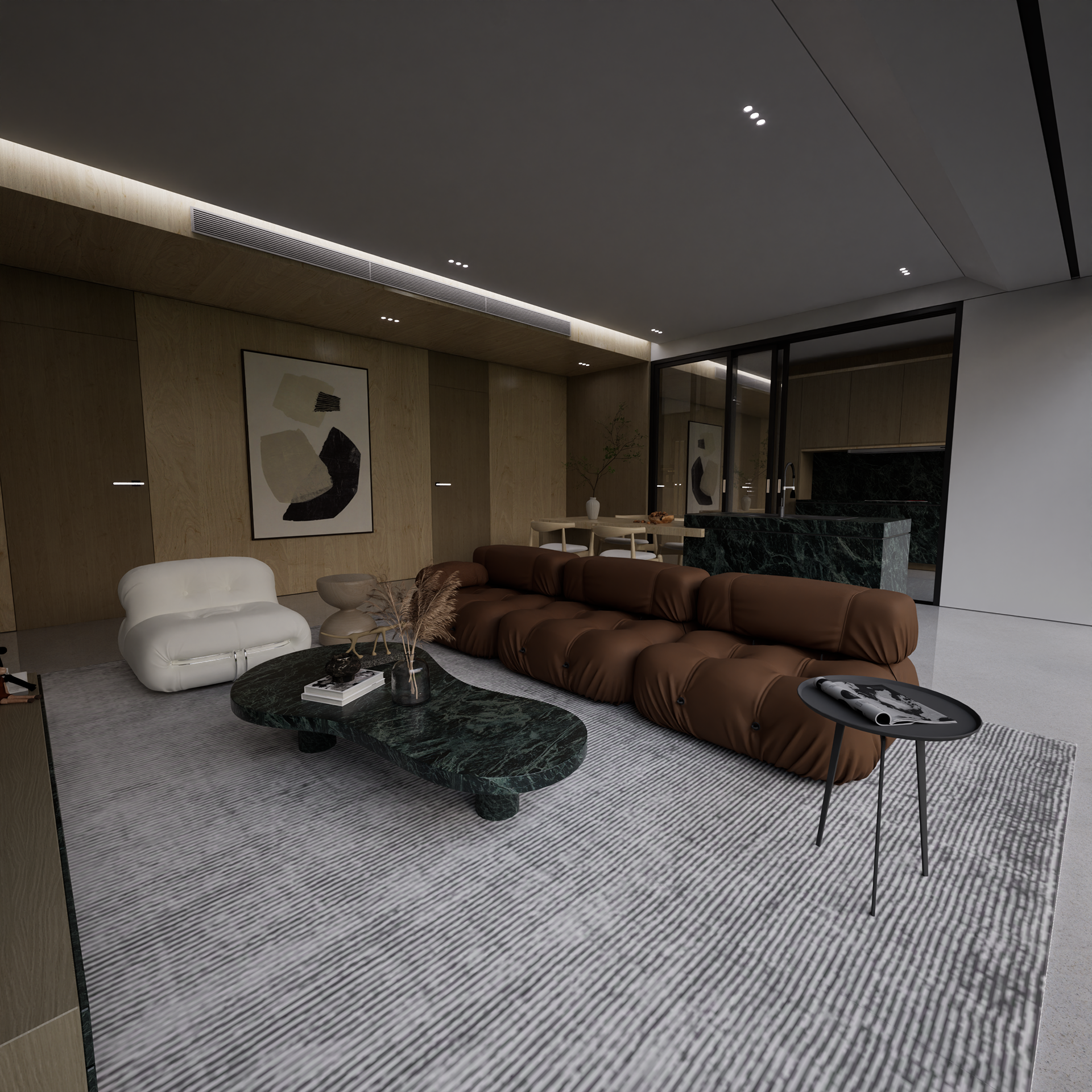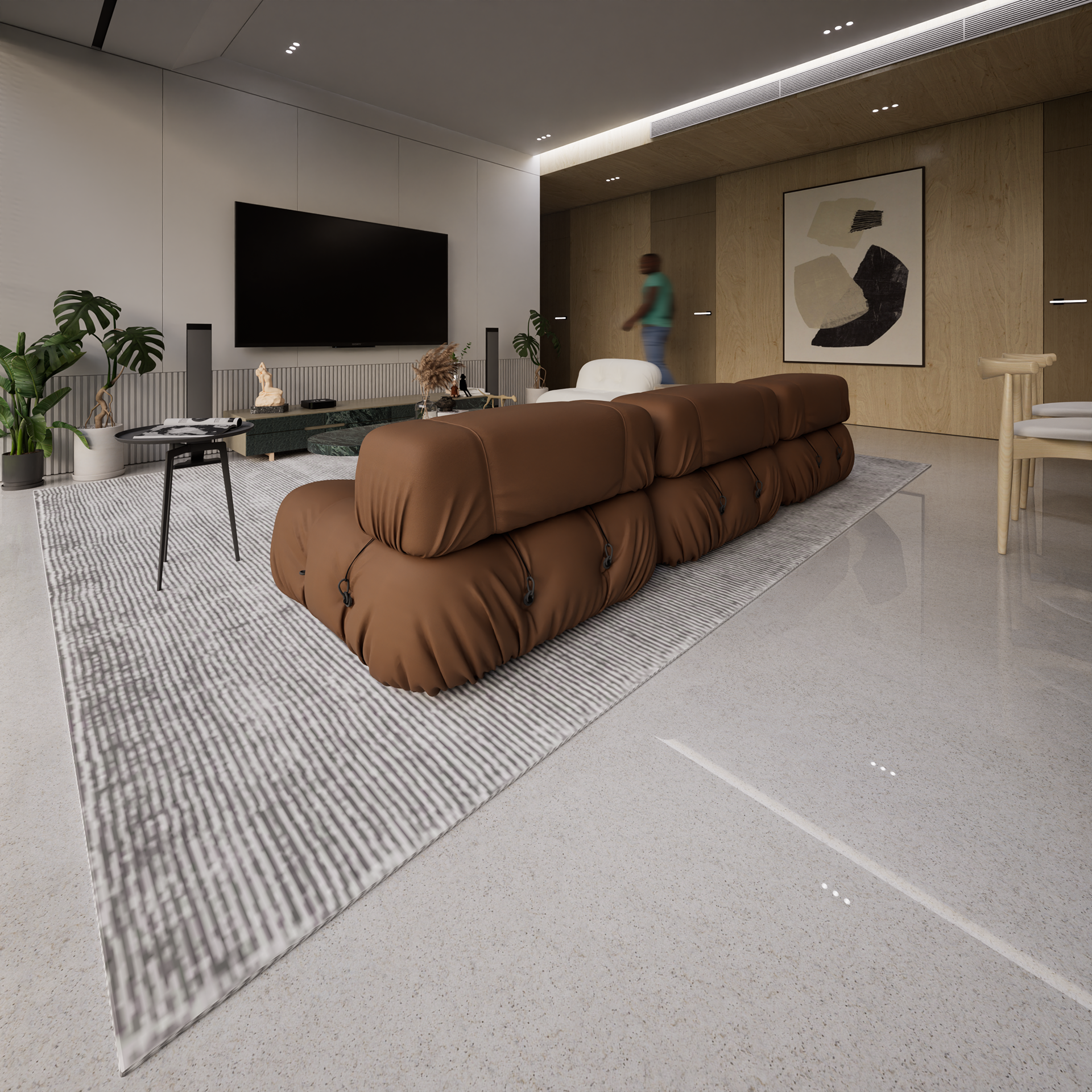 This project is a contemporary residential interior located in Manicaland, Zimbabwe, conceived as a calm, modern sanctuary that responds to the region’s climate, lifestyle, and evolving taste for refined living. Design Intent The core idea was to create a space that feels grounded, warm, and timeless, balancing modern minimalism with natural textures. Inspired by Manicaland’s lush landscapes and cooler climate, the palette leans into earthy tones, timber finishes, stone textures, and soft natural light—elements that quietly echo the surrounding environment. The open-plan living, dining, and kitchen arrangement encourages flow, family connection, and visual continuity, while maintaining clear spatial zoning through furniture placement, lighting, and material transitions.