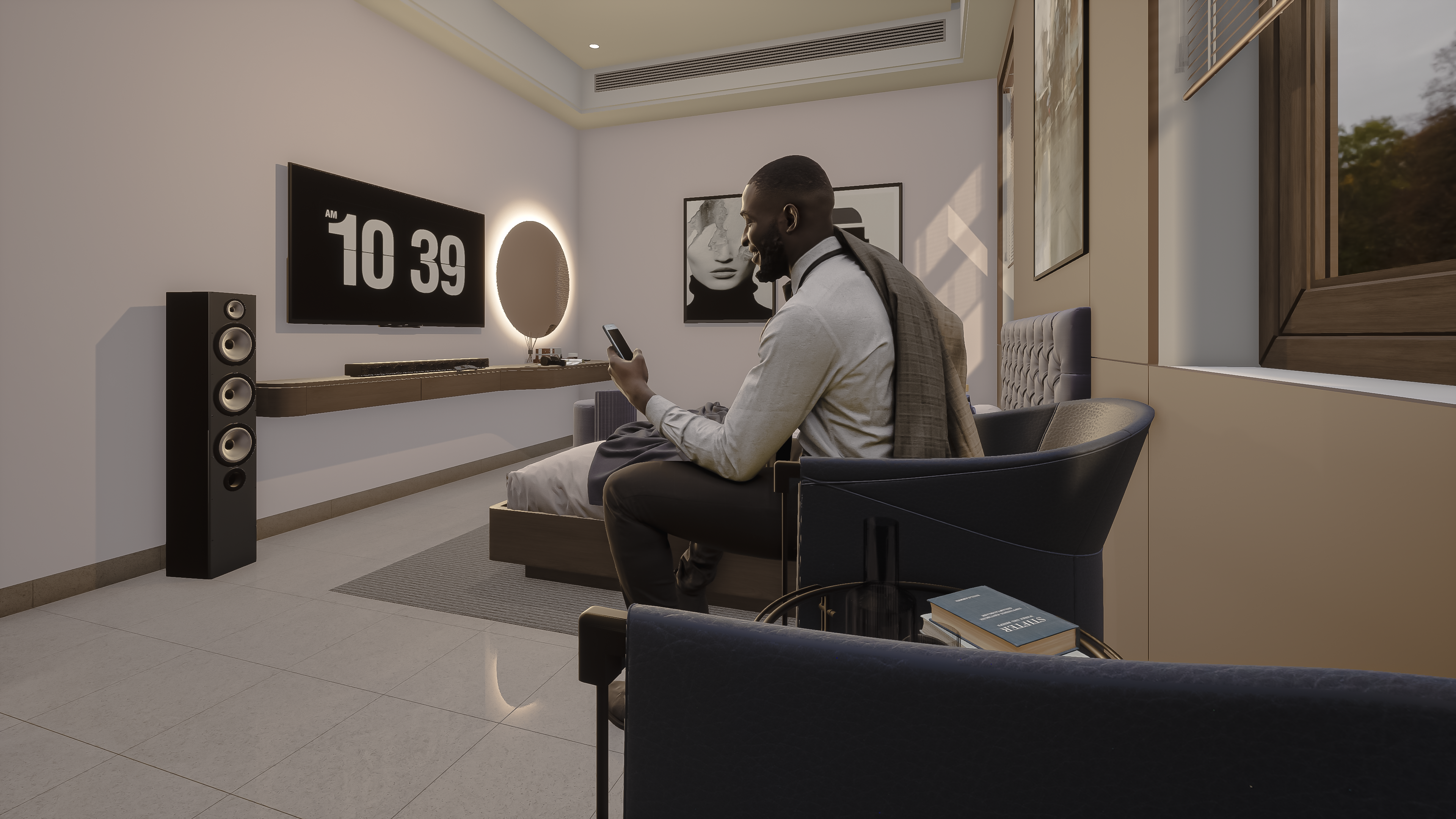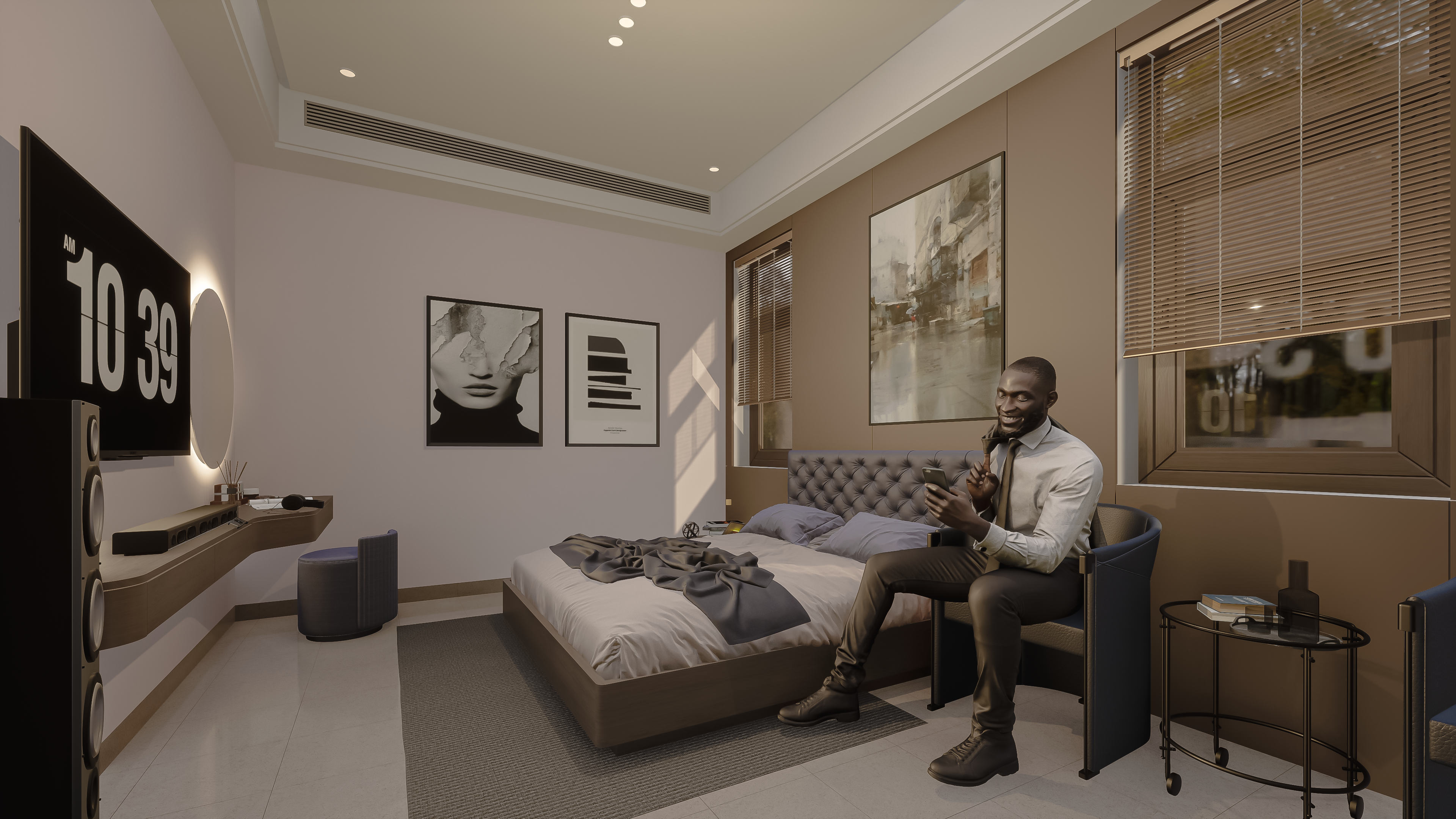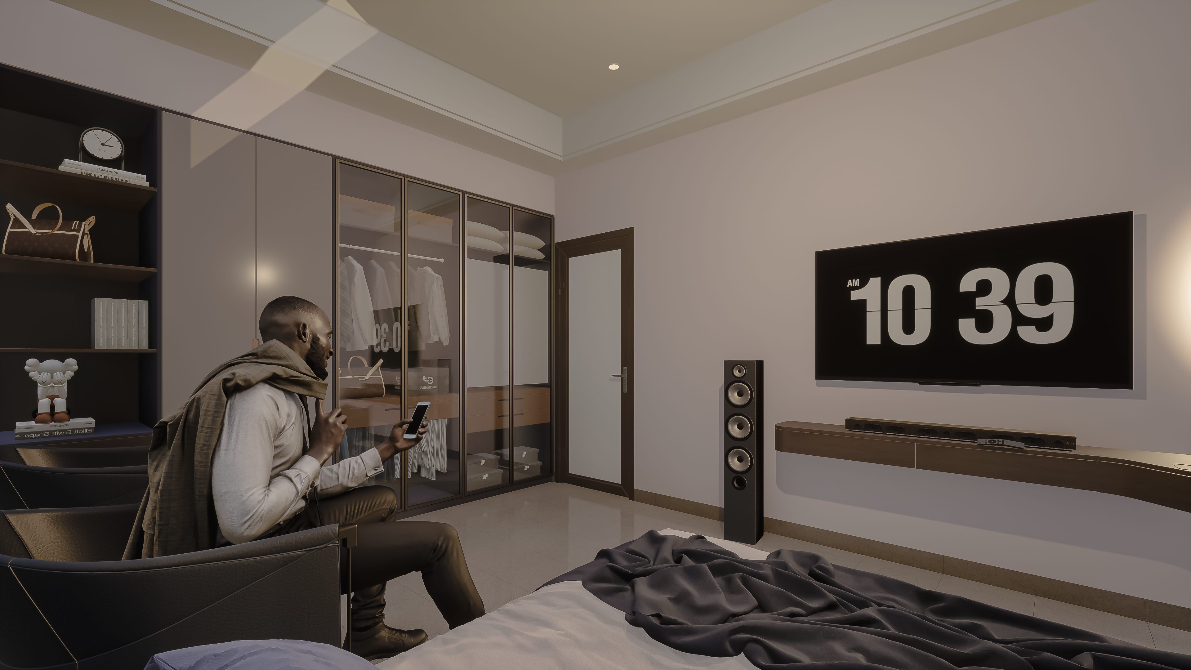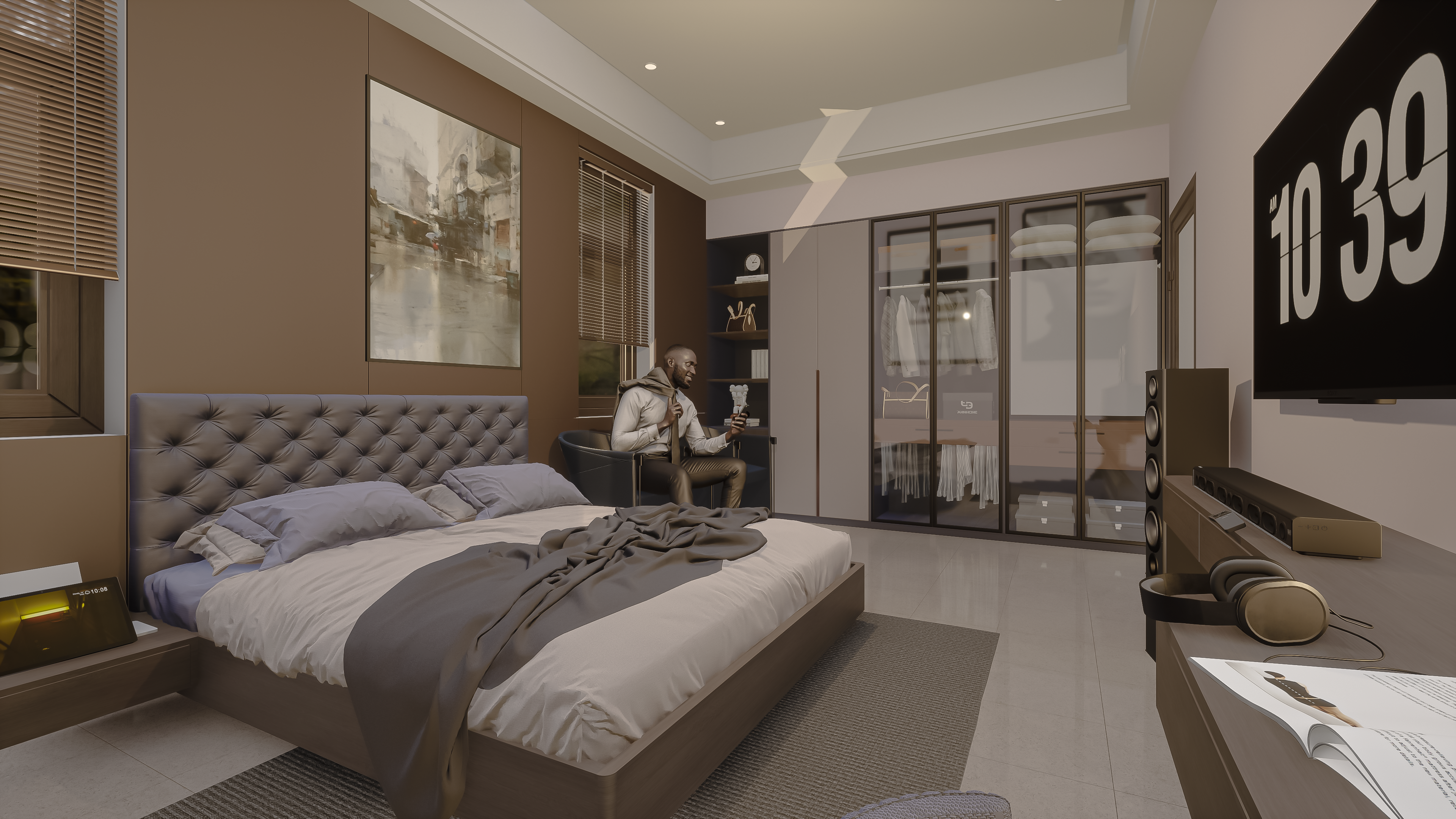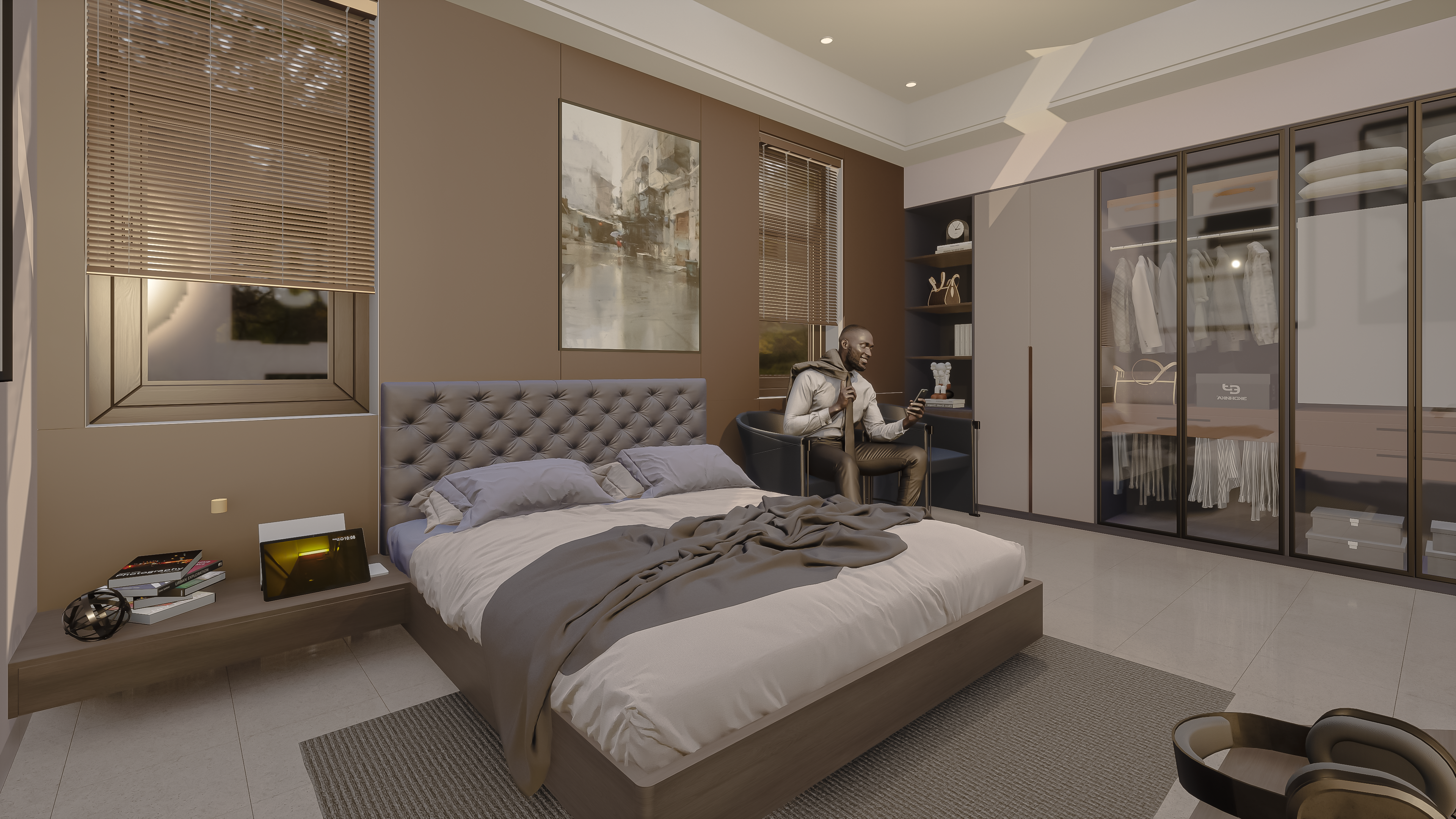 Two tone bedroom mate wall finish , translucent paneled built in closets and engineered light wood fixtures for ambient esthetic