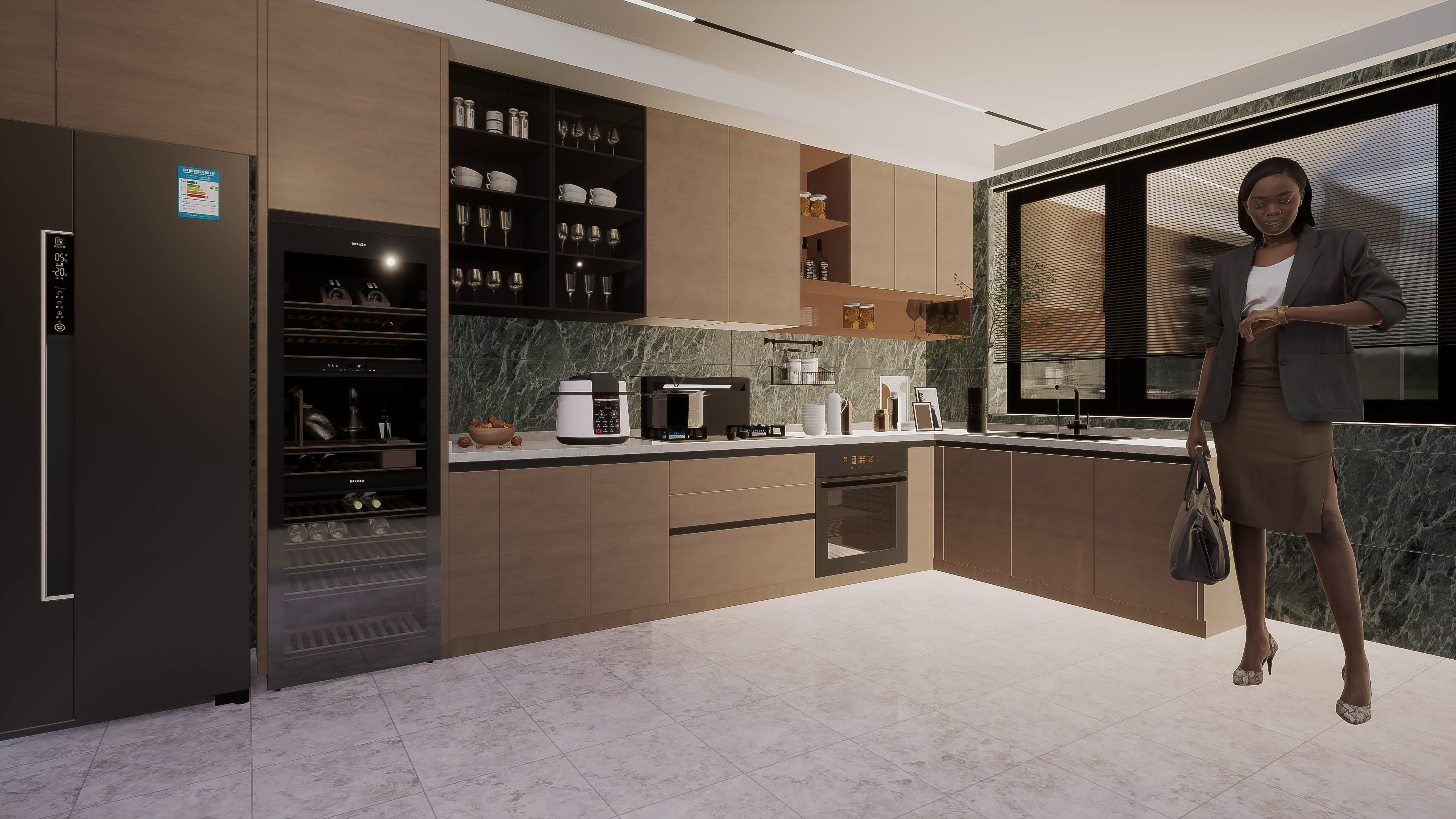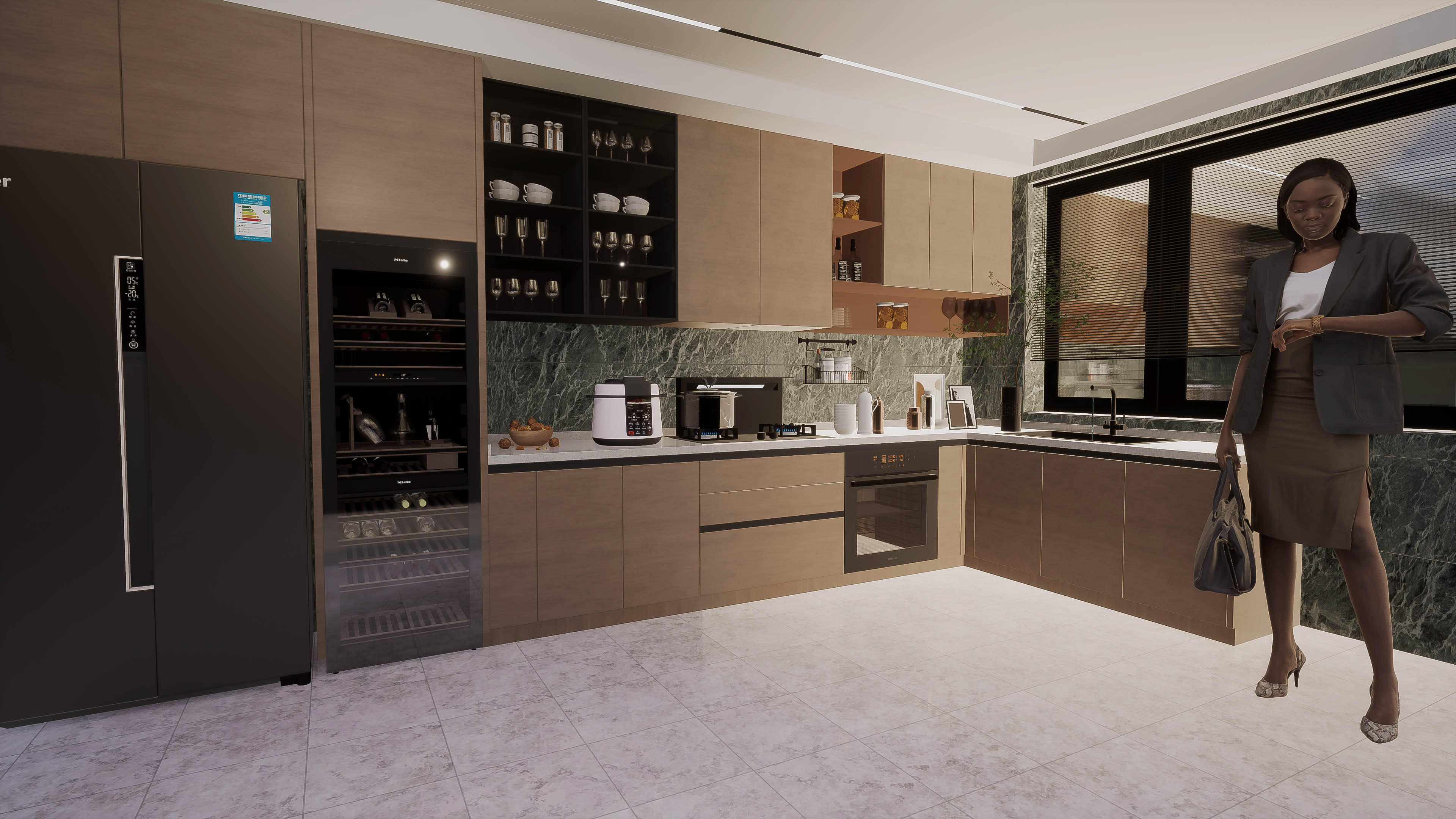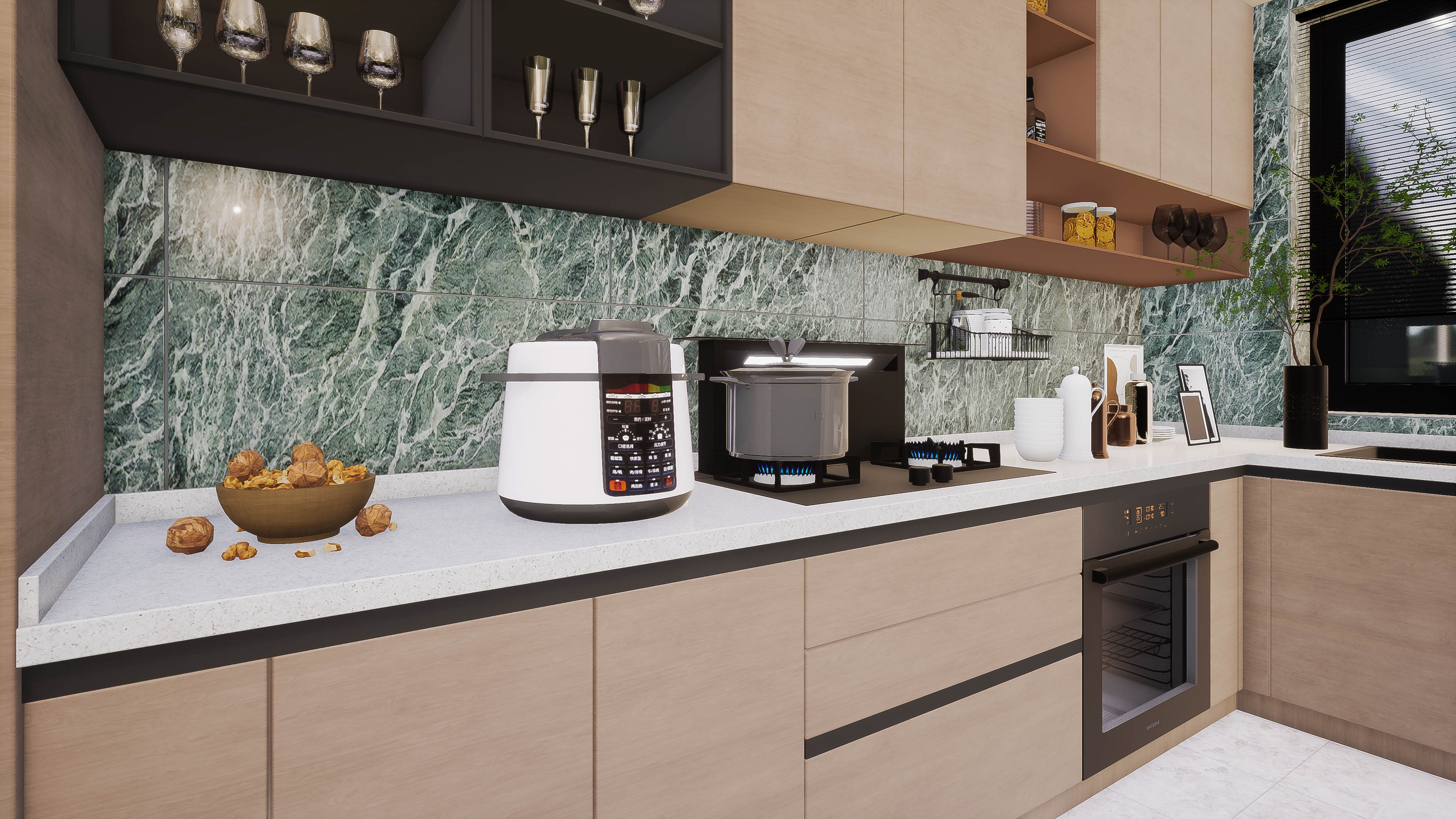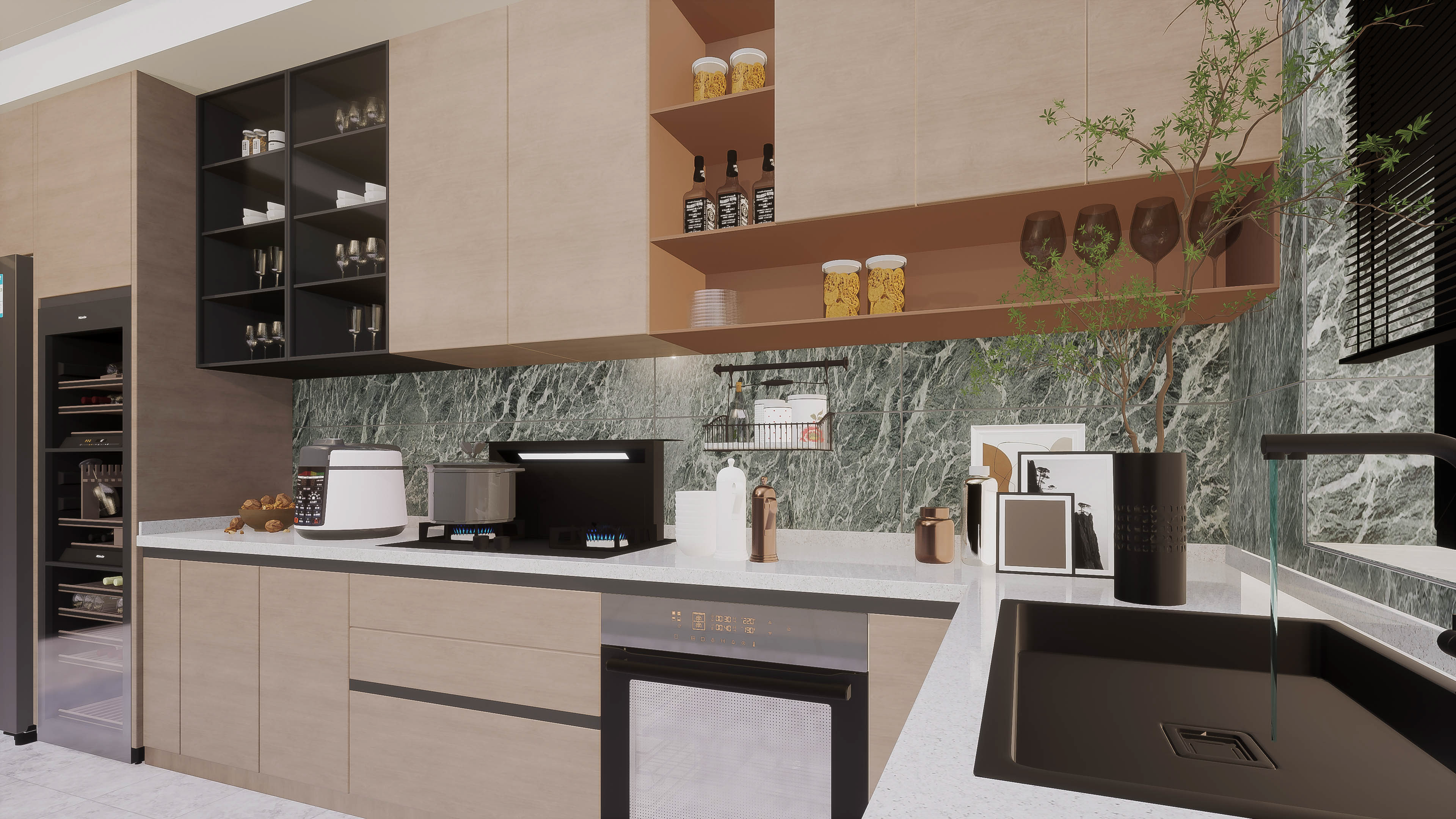 Family modern kitchen remodel , white stone countertops, dark matt chrome appliances , olive green stained marble stained wall tiles and light wood cabinets with bevel opening for a softer feel.